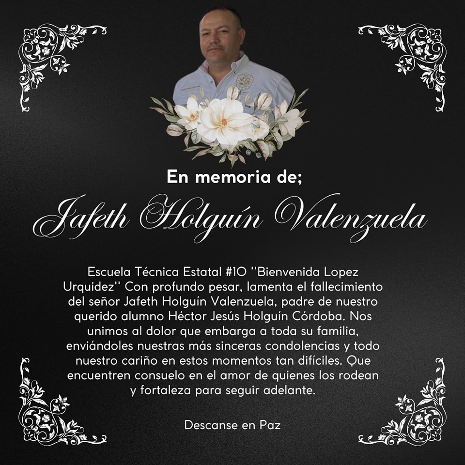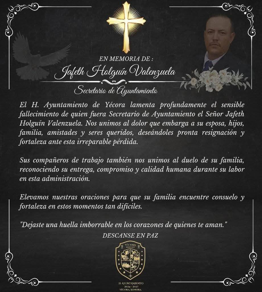 Fue a través de esquelas que se publicaron en redes sociales que trascendió la muerte de Jafeth Olguín Valenzuela, Secretario del H. Ayuntamiento de Yécora.